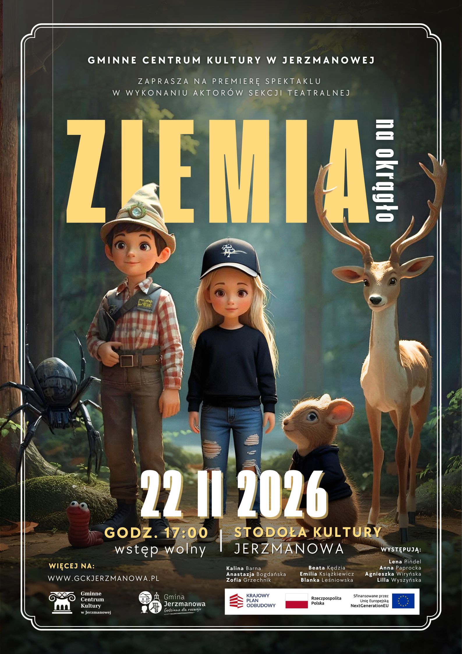 Gminne Centrum Kultury w Jerzmanowej zaprasza na premierę spektaklu „ZIEMIA na okrągło”, przygotowanego przez aktorów sekcji teatralnej. Wydarzenie stanowi uroczyste zwieńczenie projektu realizowanego w ramach Krajowego Planu Odbudowy i Zwiększania Odporności (KPO).